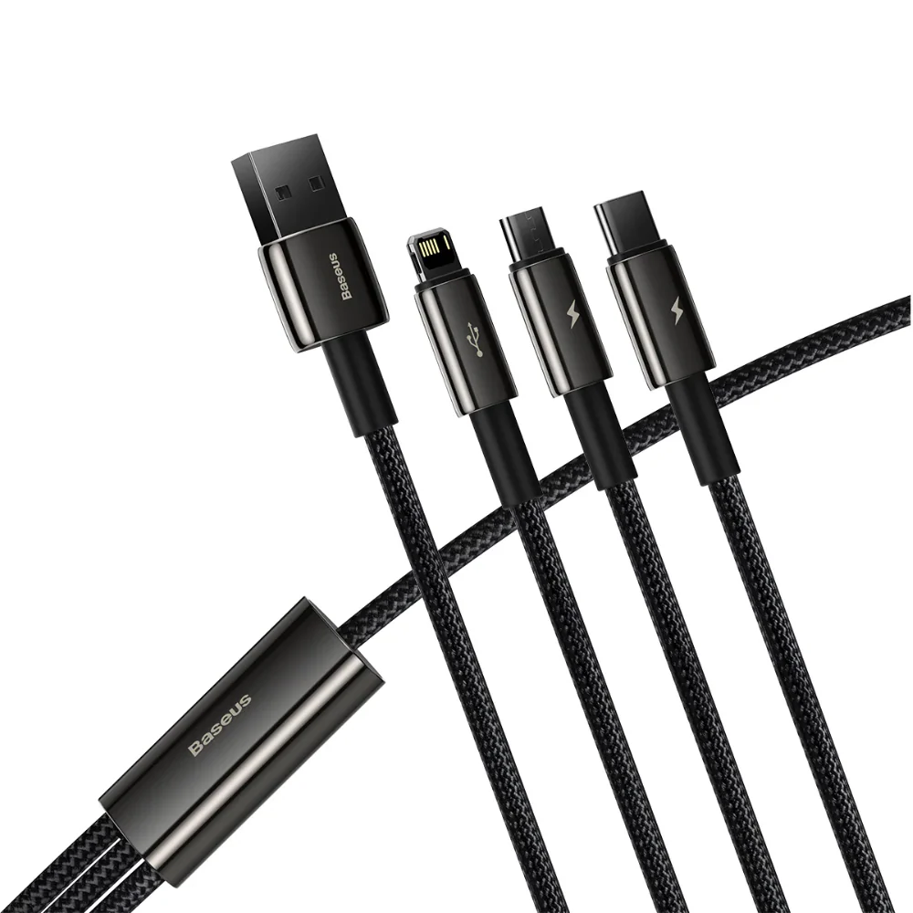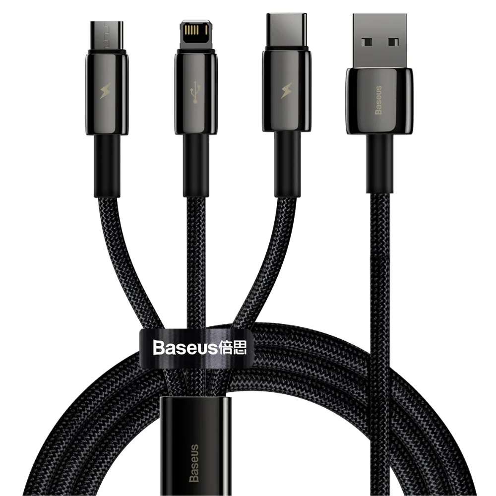 Simplifica tu carga con el cable Baseus Tungsten Gold 3 en 1 de 1.5 metros, que soporta carga rápida de hasta 3.5A y es compatible con micro USB, Lightning y USB-C.