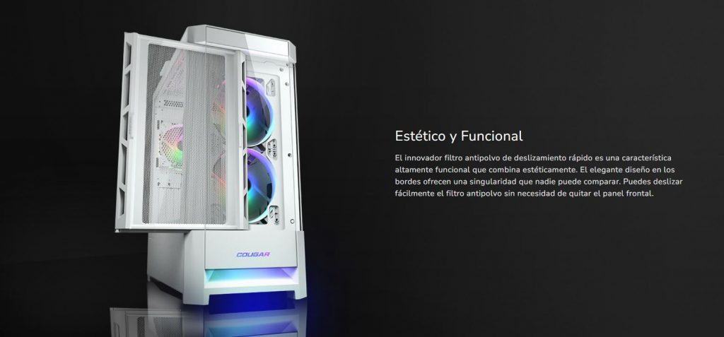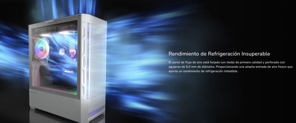 • Dos paneles frontales para un doble aprovechamiento• Innovador filtro de polvo de deslizamiento rápido• Sistema RGB integrado con sincronización de placa base ARGB de 5V• Soporte para placa base E-ATX• Tarjetas gráficas de hasta 330 mm• Hasta cinco ventiladores y un cooler de CPU de 190 mm