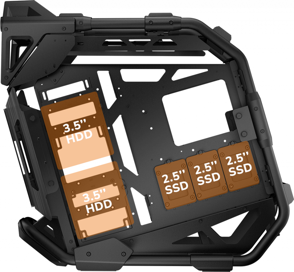 Cratus puede albergar una construcción poderosa. Tiene un excelente soporte para una placa base E-ATX, tarjetas gráficas de 460 mm, dos discos duros de 3,5″ y tres discos SSD de 2,5″, lo que permite realizar las construcciones de sistemas más extremas.